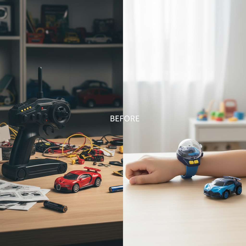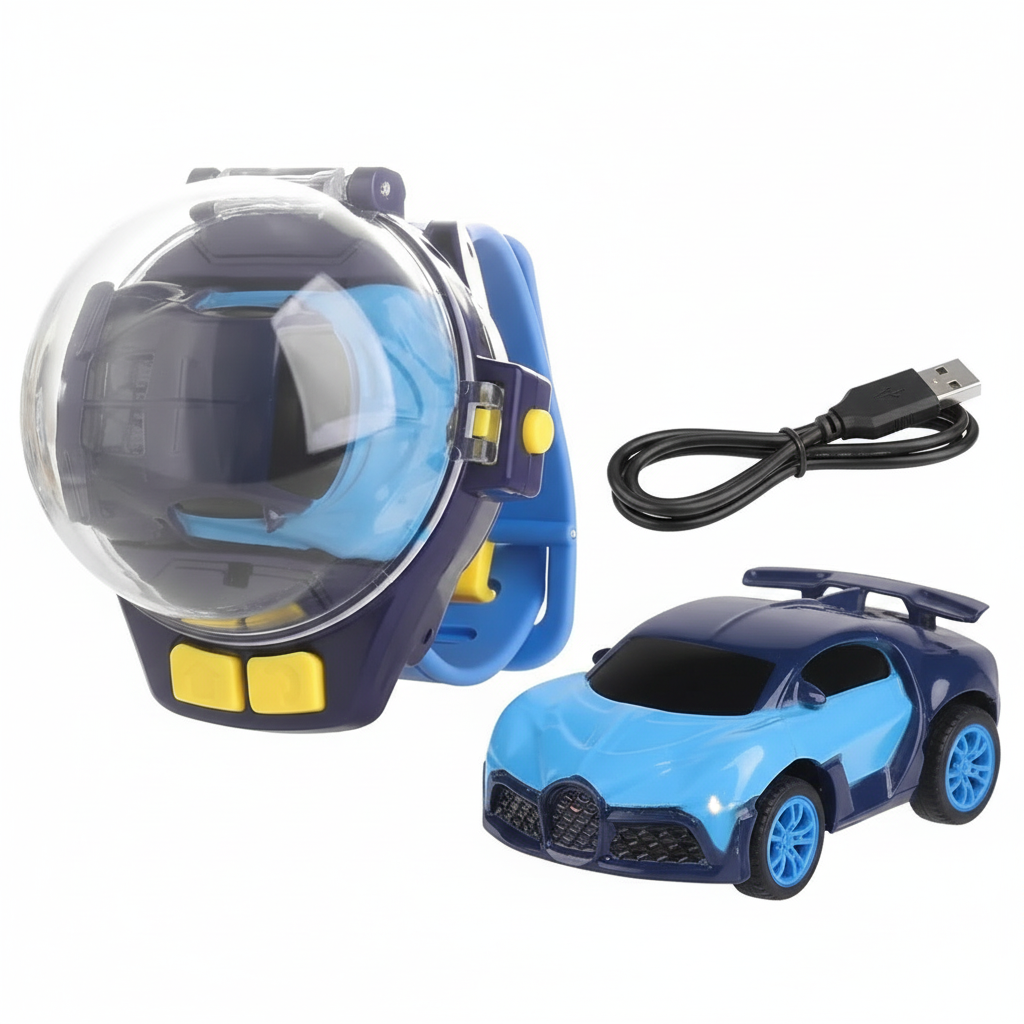 Mini RC car controlled by a wrist watch. No bulky remotes needed. USB rechargeable with LED lights. Perfect gift for boys and girls. Race anywhere, anytime with 2.4G technology.